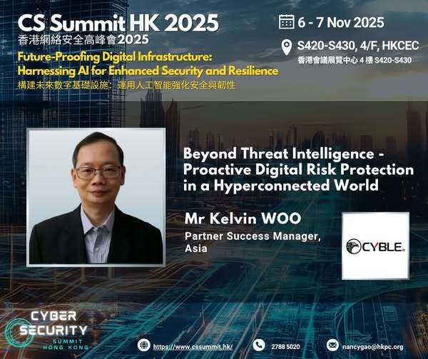 We are delighted to introduce Mr Kelvin Woo at Cyble Inc. He will share his insights on "Beyond Threat Intelligence - Proactive Digital Risk Protection in a Hyperconnected World", examining how organizations can stay ahead of cyber threats by adopting proactive digital risk protection strategies. The presentation will be delivered in English from 3:45 pm to 4:15 pm on 6 November, 2025.