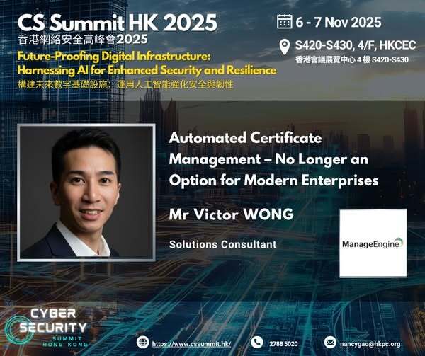Efficient and intelligent certificate management will accelerate the upgrade of security operations. CS Summit 2025 is pleased to invite Mr Victor Wong from ManageEngine to deliver a presentation “Automated Certificate Management – No Longer an Option for Modern Enterprises” — stay tuned. His session is scheduled for 3:00pm to 3:30pm on 7 November 2025.