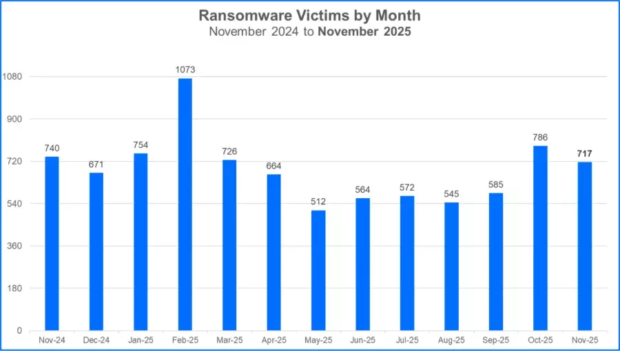 For this month's report, we analyzed data from November 1 to November 30 and recorded a total of 717 claimed ransomware victims.